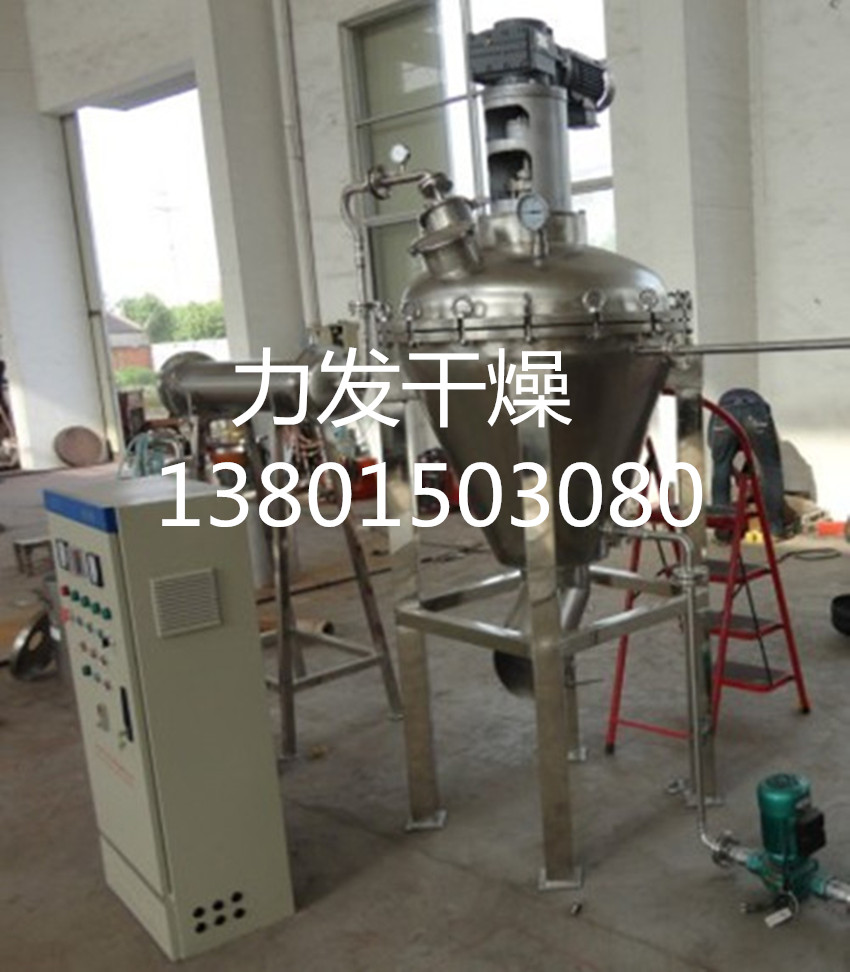 概述 : 單錐真空混合干燥機烘干機是一種利用螺帶將物料旋轉提升及圓錐夾套、空心螺帶內同時通入傳熱介質(如熱水、導熱油、蒸汽等),使加熱后物料從四周提升并從中間下落,快速不斷的循環翻轉,并通過筒體內抽真空將水汽及時帶走, 使物料在短時間內達到干燥和混合目的。